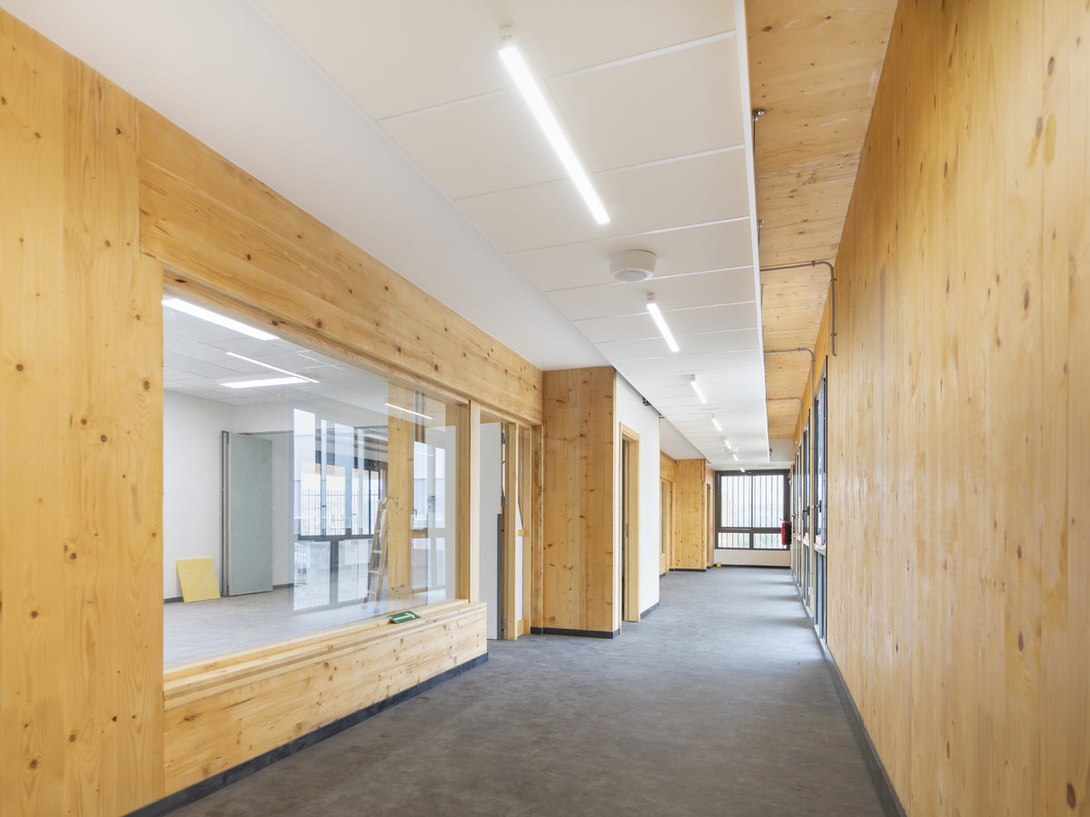 Proyecto y construcción de un centro educativo modular con materiales de bajo consumo energético. Se trata de un edificio sostenible, diseñado con criterios de eficiencia energética y reducción de emisiones de CO₂. La estructura modular se ejecuta en madera CLT, con una configuración íntegramente en planta baja, compuesta por tres edificios diferenciados: módulo de Primaria, módulo de Infantil y módulo de vestuarios, y una urbanización exterior formada por varios patios y una pista deportiva.